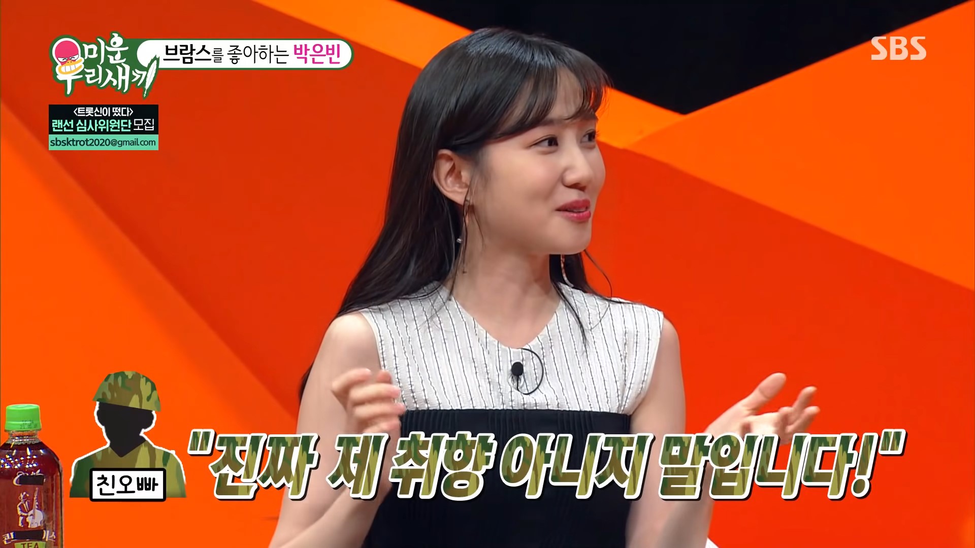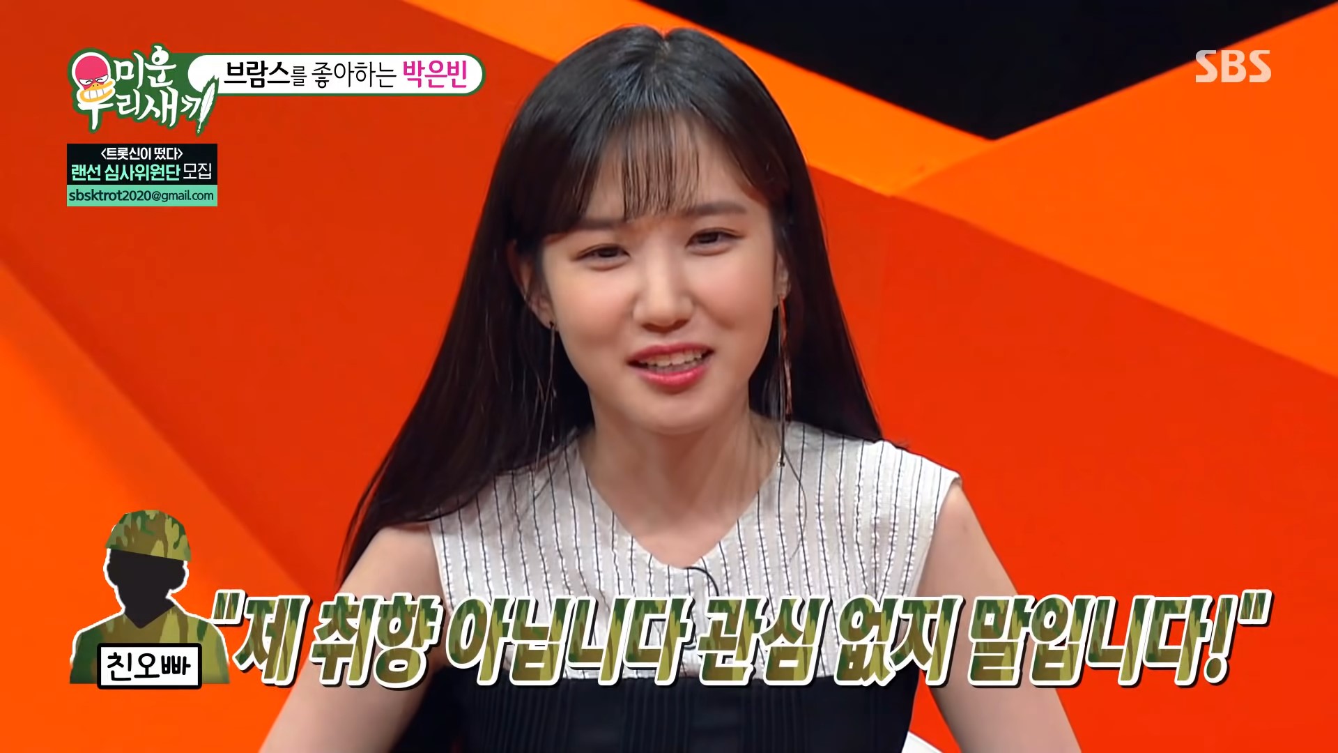 當時主持人聽聞朴恩斌有位親哥哥後,便好奇想知道哥哥的朋友們有沒有曾試圖想要藉機會認識,結果朴恩斌就分享了哥哥在軍中的故事,「他入伍後正好上一屆的學長是我的粉絲,並且還不是普通粉絲,是有加入官咖(粉絲俱樂部)的鐵粉!」結果這位學長竟在休息日向哥哥宣傳朴恩斌,並且還說,「這是我喜歡的藝人,你看著也會深陷她的魅力~」
