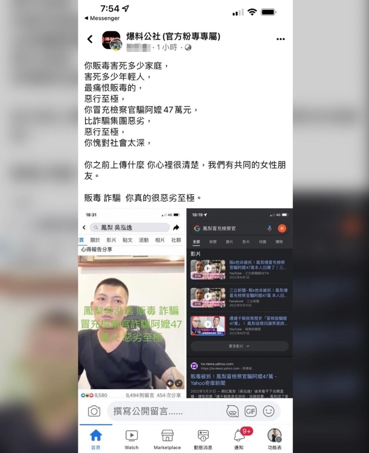 一名網友日前在爆料公社發文痛批鳳梨,曾經販毒害死許多年輕人跟家庭,還冒充檢察官欺騙阿嬤47萬元:「你愧對社會太深,你之前上傳什麼你心裡很清楚,我們有共同的女性朋友,你真的很惡劣至極!」並挖出了有關他犯罪黑歷史的報導。當時鳳梨也親自發文回應:「我一直都承認我是惡行至極之人,我到底什麼時候包裝自己,否認過?我老早就已經說過所有你想的到的壞事我都做過了」,強調自己:「所以我不是一直都在彌補嗎?」、「我惡劣至極,我承認!」