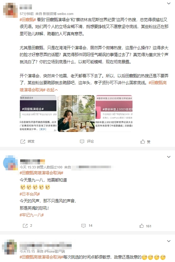 而演唱會取消的消息很快就在微博上掀起討論,不過18日正好是中國的九一八事變紀念日,為了表示哀悼,許多人都會自發性發起「禁娛令」,因此田馥甄的行為也被認為是「炒作」,還有網友翻出義大利麵事件的貼文狠批,「每次挑選的時間點都很敏感,故意還是無意?」更嘲諷表示:「開個演唱會,突然來個地震,老天都看不下去了」!