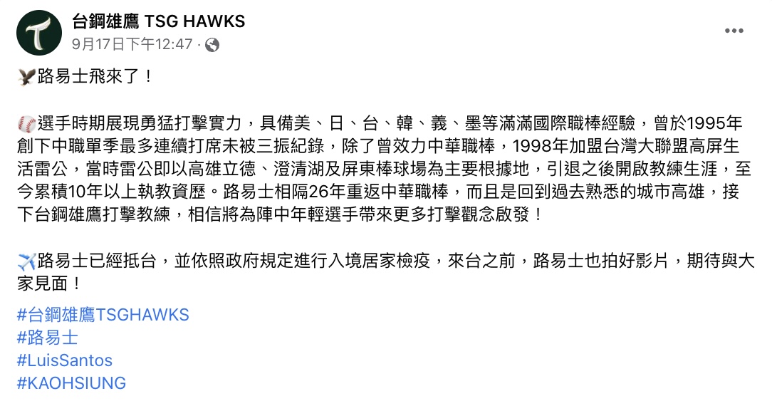 台鋼雄鷹「那個男人」來了!上週六中華職棒新軍台鋼雄鷹宣布新任打擊教練將由曾在台灣兩聯盟效力過的洋將路易士(Luis Santos)擔任,將是他繼1996年兄弟象選手時期之後、相隔26年重返中華職棒。