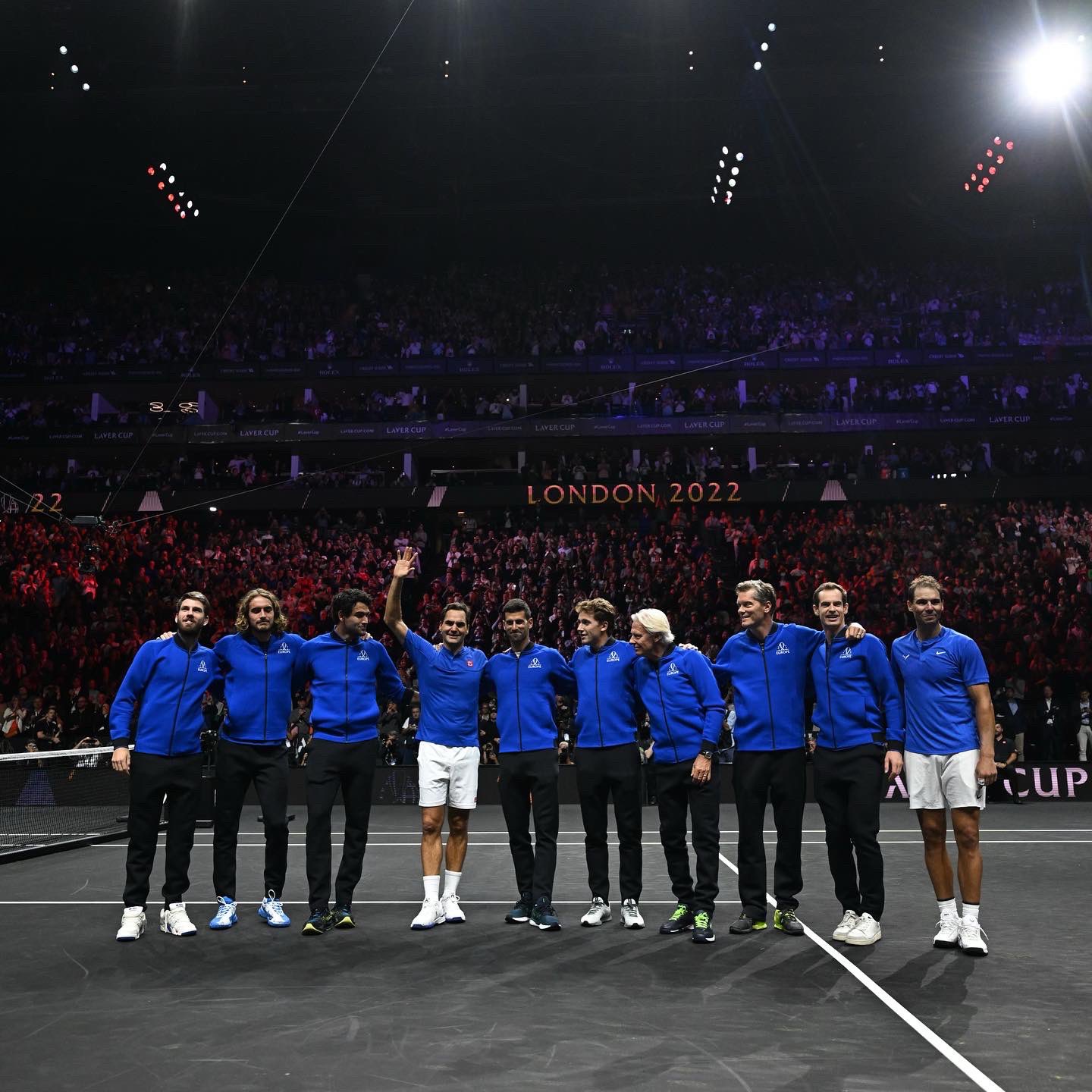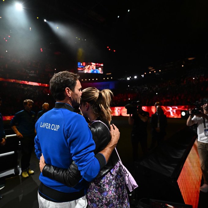 而這場賽事他們面對世界隊對手,雙方在前兩盤打完後戰成平手,比賽進入搶10後雙方也一路拉鋸,最終由美國組合以4:6、7:6(7:2)、11:9勝出,比賽結束後現場瞬間變成Federer的退休儀式。Federer不僅與Nadal緊緊相擁,並和所有歐洲隊隊友致意,隨後走進球場中央接受現場17,000位球迷的鼓掌。受訪時Federer表達對家人、團隊和球迷的感謝時,一度流下英雄淚,一旁的好友Nadal也哭成淚人兒。