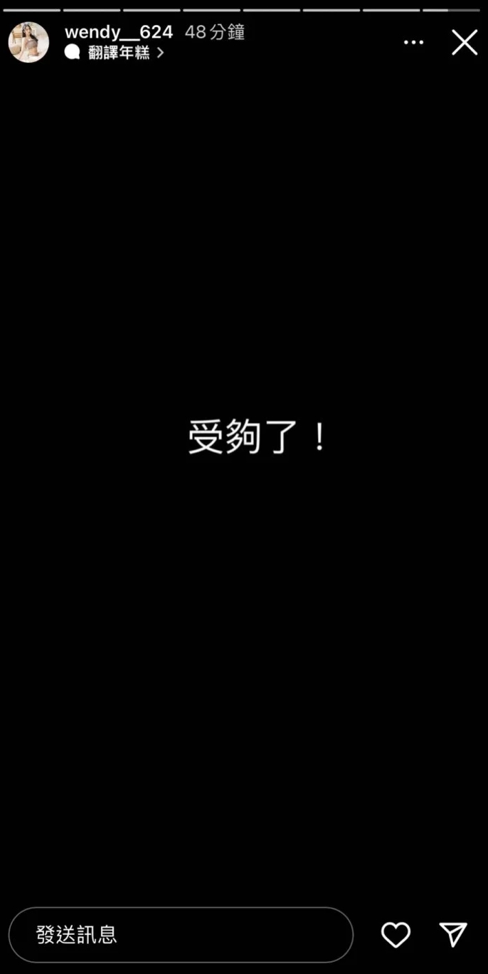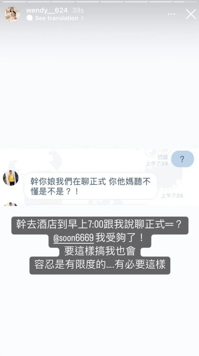 Wendy27日一早在IG限時動態怒罵:「受夠了!」隨後便公開與孫生的吵架內容,只見對方先是怒飆三字經並表示:「我們在聊正式(事),你他媽聽不懂是不是?!」而她則不滿回覆:「去酒店到早上7:00跟我說聊正式(事)?我受夠了!要這樣搞我也會,容忍是有限度的,有必要這樣?」不過當動態公開沒多久後,她便火速刪除,也沒有多做解釋。