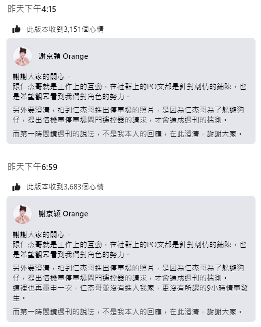 許仁杰的婚變事件鬧得沸沸揚揚,他先是在聲明中表示:「被拍攝的車道前後出口是通往我租的住所」,與他鬧出緋聞的謝京穎則是強調,「仁杰哥並沒有進入我家,更沒有所謂的9小時情事發生」,但卻有居民跳出來打臉,再度引發外界的高度關注!