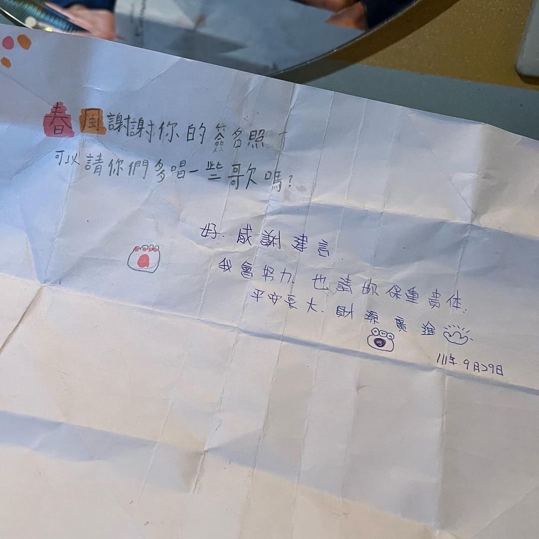不僅如此,春風還公開了紙條的內容,只見小粉絲表示:「春風,謝謝你的簽名照,可以請你們多唱一些歌嗎?」其中還特別用不同顏色的筆將春風的名字標示出來,展現出孩子純真的一面,而他則回覆:「好,感謝建言!我會努力,也請妳保重貴體,平安長大,財源廣進!」最後還畫上了金元寶跟熊掌,一來一往的互動十分可愛,小女孩的舉動也融化了不少人的心!