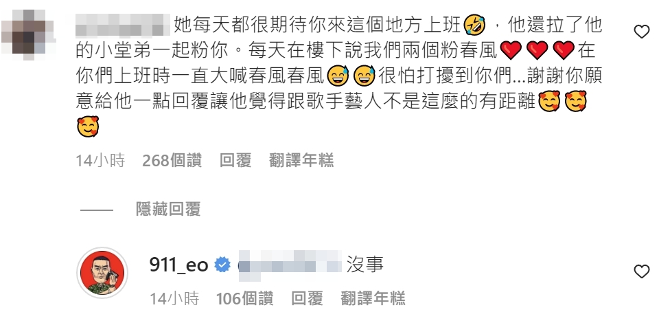 對此,疑似是小女孩的家人現身留言區表示:「她每天都很期待你來這個地方上班」,甚至還拉著堂弟一起成為春風的粉絲,「在你們上班時一直大喊春風、春風,很怕打擾到你們...謝謝你願意給他一點回覆,讓他覺得跟歌手藝人不是這麼的有距離~」而親民的春風則表示:「沒事!」網友見狀都紛紛大讚,「暖男是你!」、「好可愛的小歌迷~簡單又真誠的對話」、「浪漫男子漢!」