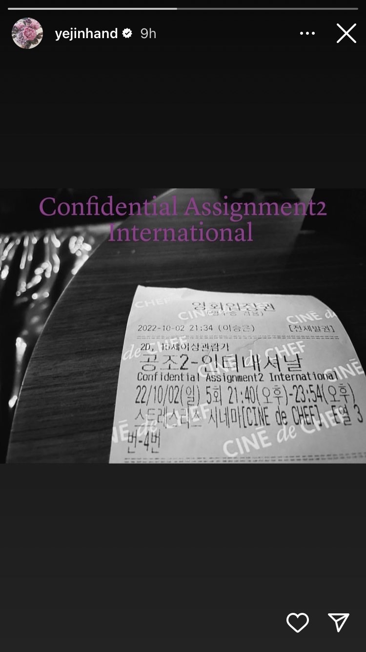 玄彬近期忙於電影新作《機密同盟2》的採訪及活動,這是他婚後首部推出的作品,因此也格外受到關注!雖然孫藝真近期因養胎而減少外出機會,以降低風險,不過向來愛夫的她仍是親自到電影院欣賞作品《機密同盟2》,她也在2日透過個人IG限動PO出電影票根,並特地打上英文片名「Confidential Assignment 2 International」為丈夫做宣傳!