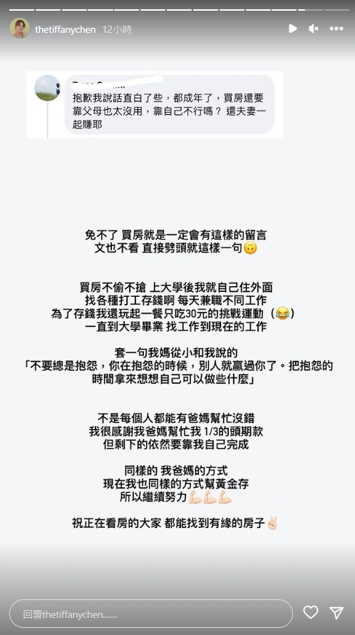 沒想到貼文曝光後,引起網友不滿留言表示,「都成年了,買房還要靠父母也太沒用,靠自己不行嗎?還夫妻一起賺耶!」對此,陳彥婷4日凌晨將該留言轉發在IG限時動態並回擊,「不要總是抱怨,你在抱怨的時候,別人就赢過你了,把抱怨的時間拿來想想自己可以做些什麼!」