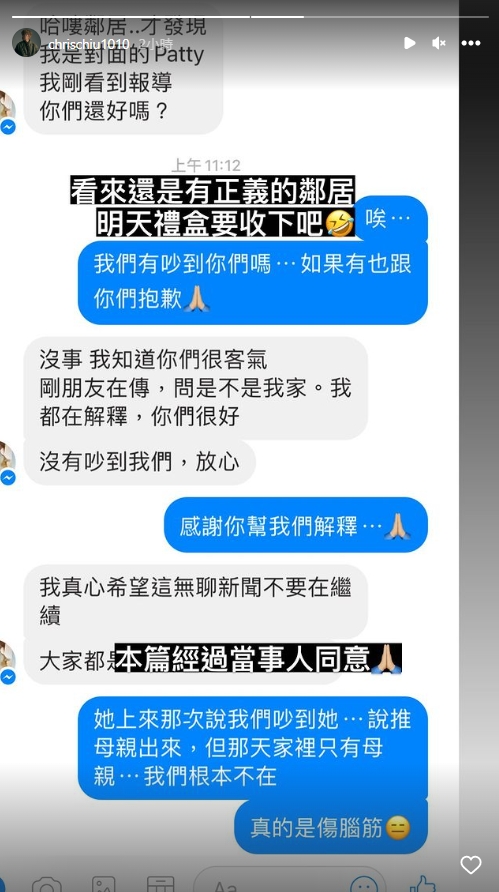不僅如此,他隨後又曬出與鄰居私訊的對話截圖,只見對方先是關心狀況,並表示「沒有吵到我們,放心!」也明白邱家為人都很客氣,他則感動說道,「看來還是有正義的鄰居,明天禮盒要收下吧~」