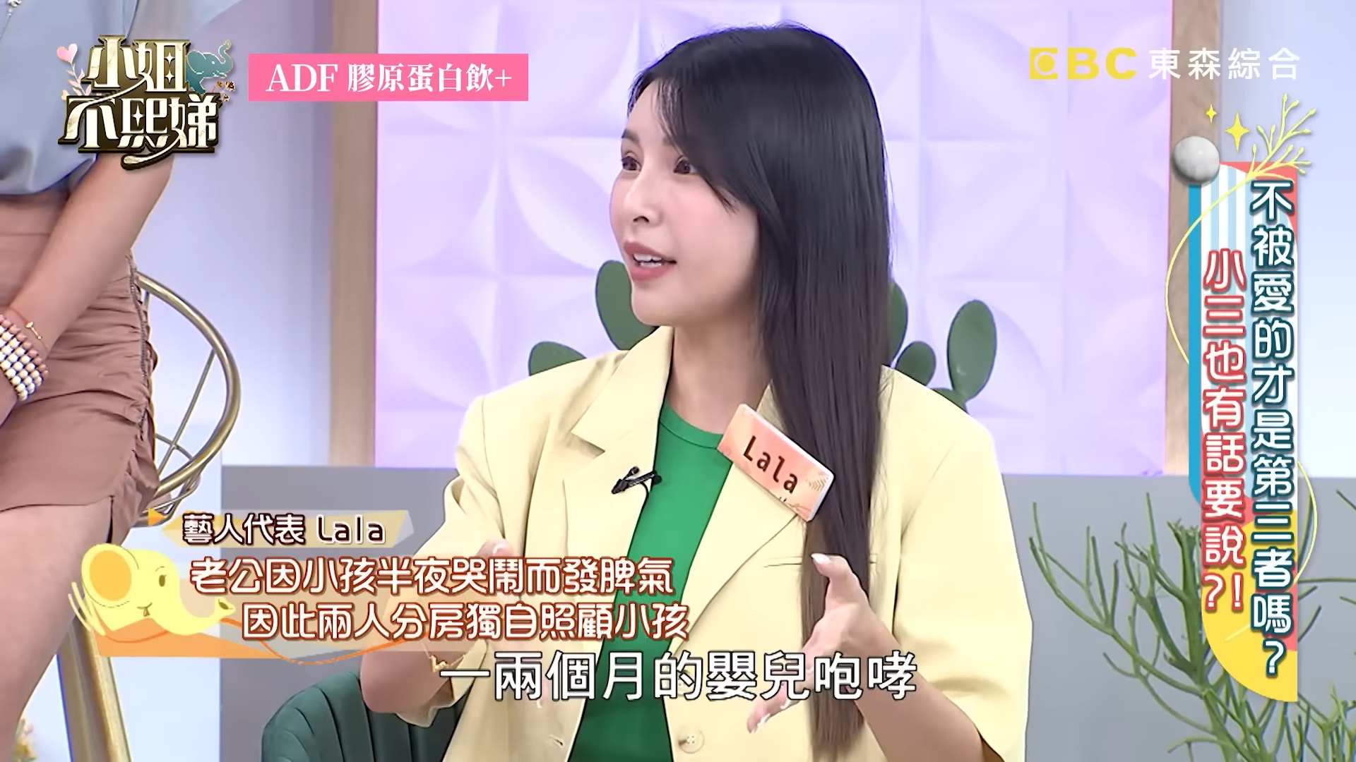 在節目中,Lala表示婚前就曾抓包前夫出軌,結果分手隔天,竟然發現「懷孕」了,她表示自己原先不是會原諒的人,但看在小孩及對方不斷求復合的份上,所以才與對方重修舊好並登記結婚。然而前夫對於孩子出生後的生活難以適應,有一次還因為嬰兒半夜哭鬧,結果對方竟然對著嬰兒大罵,讓她氣到因此分房睡,獨自一人擔起照顧孩子的責任。