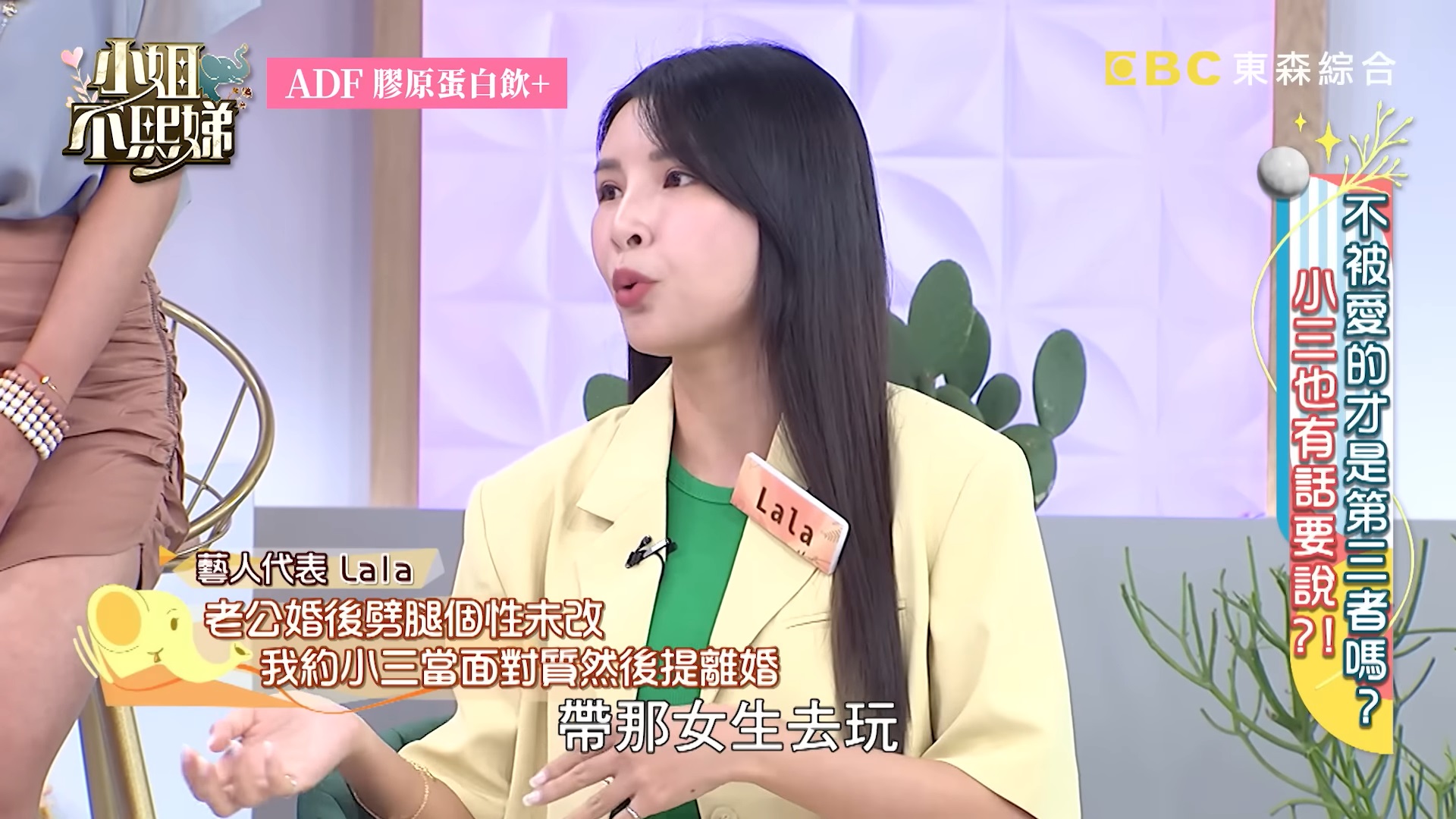 後來,Lala的朋友告知前夫再度外遇的消息,對方還對小三聲稱都是她一直鬧離婚,所以感情才會出狀況!她表示當時前夫經濟狀況不穩定,為了維持家計,自己還會揹著孩子到市場做生意,「我回過頭去對那些時間點,就是我很努力在為這個家裡付出,可是他是在那個時間點帶那女生去玩」,誇張的行徑讓小S當場氣炸並痛罵,「不要臉到極點欸!」眾人更是替她感到忿忿不平。