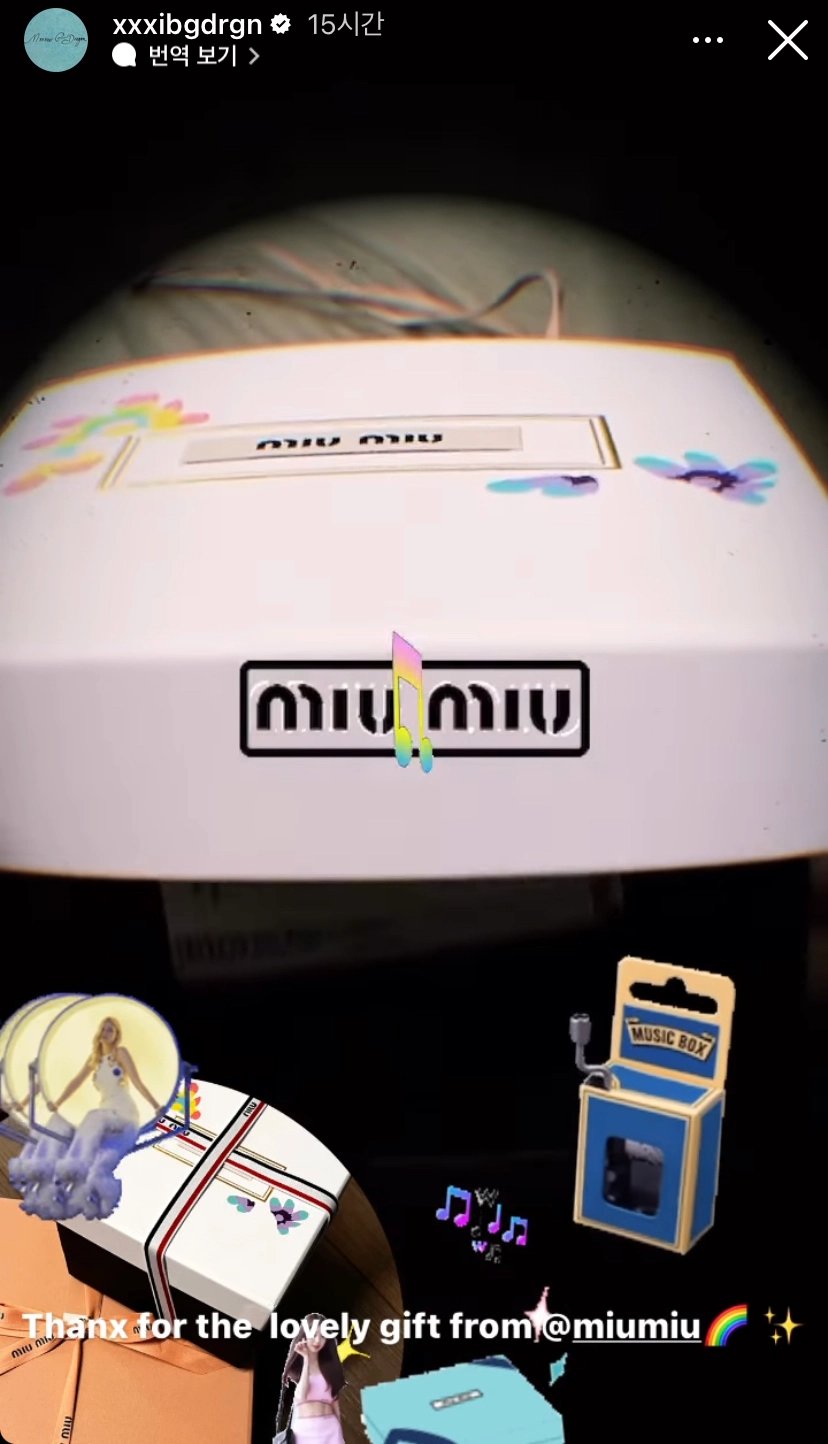 南韓許多偶像、藝人在收到品牌、廠商的禮物、商品後,都會在IG發文以示感謝,而時尚品牌miu miu的愛用者GD,在日前收到禮物盒後,也同樣在IG限動上傳照片,並且寫下,「Thanx for the lovely gift from miu miu.」(謝謝來自miu miu的貼心禮物)另外GD也維持了一貫的發文作風,在照片的後製上用了許多GIF貼圖裝飾。
