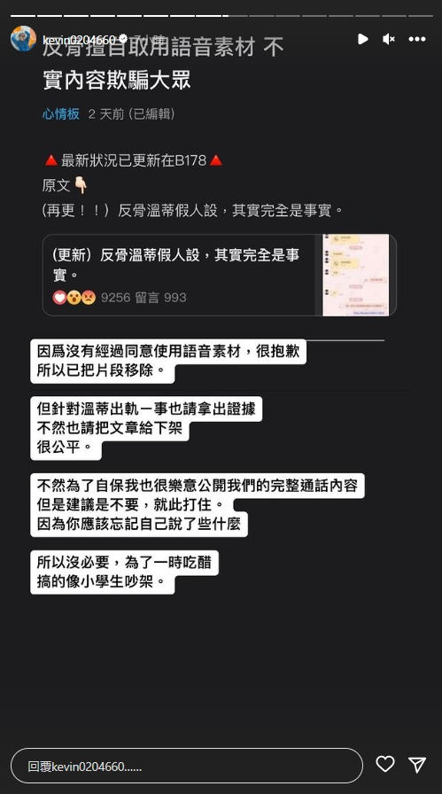 針對元配要求把未經允許使用的通話片段刪除一事,酷炫先是向對方認錯,「因為沒有經過同意使用語音素材,很抱歉,所以已把片段移除。」但是對於Wendy遭指控外遇人夫的部分,他嚴肅表示:「請拿出證據,不然也請把文章給下架,很公平。不然為了自保我也很樂意公開我們的完整通話內容,但是建議是不要,就此打住。因為你應該忘記自己說了些什麼。」,認為沒必要為了一時吃醋,而鬧得場面如此難看。