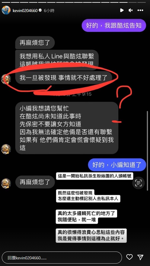不僅如此,元配還用小帳私訊孫生的粉絲團並表示:「我一旦被發現,事情就不好處理了」,擔心事情敗露後,會讓老公及Wendy懷疑到自己身上,但酷炫則表示:「既然這麼怕被發現,怎麼還主動標記別人、去私訊別人?」認為對方的邏輯很有問題,還有很多破綻都沒有公布,但希望「事情到這裡為止就好」,不要再越鬧越大。