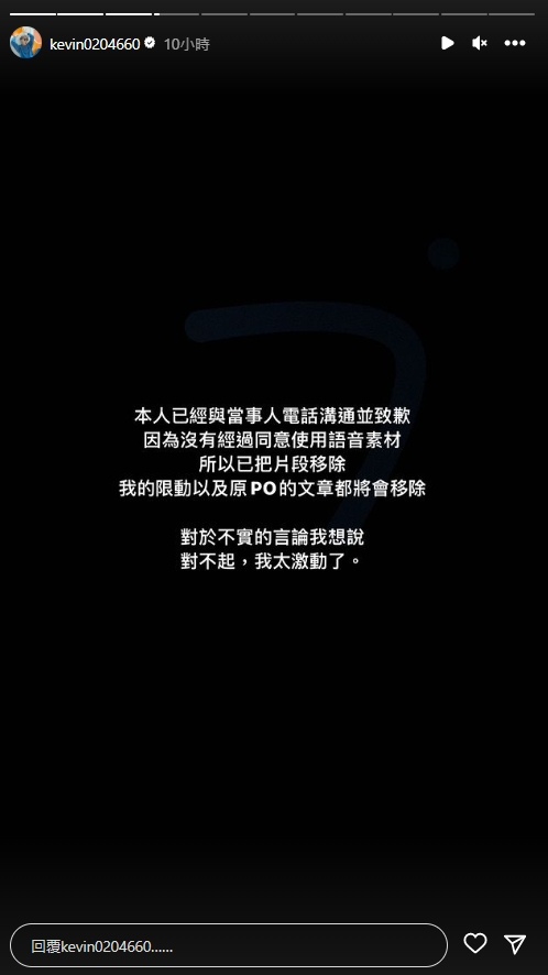 而酷炫則是於深夜再度PO文道歉,「本人已經與當事人電話溝通並致歉,因為沒有經過同意使用語音素材,所以已把片段移除,我的限動以及原Po的文章都將會移除,對於不實的言論我想說,對不起,我太激動了。」