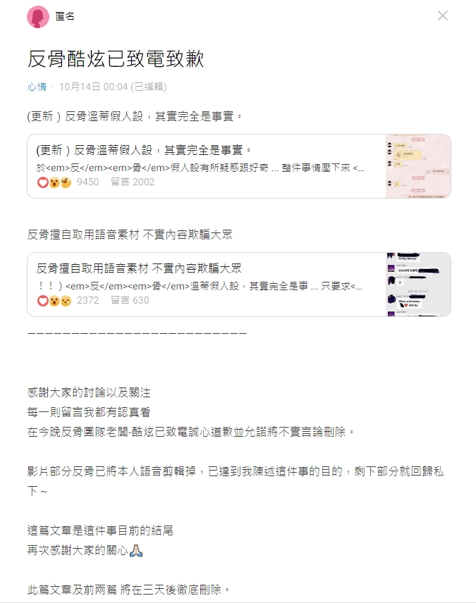 不僅如此,疑似是元配的網友再度更新貼文,證實已經與酷炫通過電話,「在今晚,反骨團隊老闆酷炫已致電,誠心道歉並允諾將不實言論刪除。影片部分,反骨已將本人語音剪輯掉,已達到我陳述這件事的目的,剩下部分就回歸私下~」並承諾將所有相關文章在三天後刪除,也謝謝所有人的關心。對此,有網友對於「三天後刪除」不能理解,認為如果有意和好,應該要跟酷炫一樣立刻刪除,忍不住質疑,「讓流量跑完嗎?」再度掀起討論。