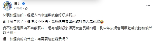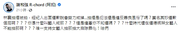 事實上,不只郭鬼鬼力挺林襄,謝和弦也發文表示:「抽煙是犯法還是違反善良風俗了嗎?莫名其妙道歉個屁啊?」,認為不應該道德綁架女藝人!網紅陳沂則不解表示:「抽煙又不犯法,竟然還需要出來跟社會大眾道歉!」自己是因為不喜歡煙味,加上抽菸對皮膚會有影響,所以才不抽,但是並不認為這件事有如此嚴重。