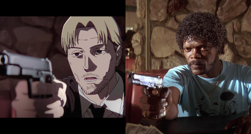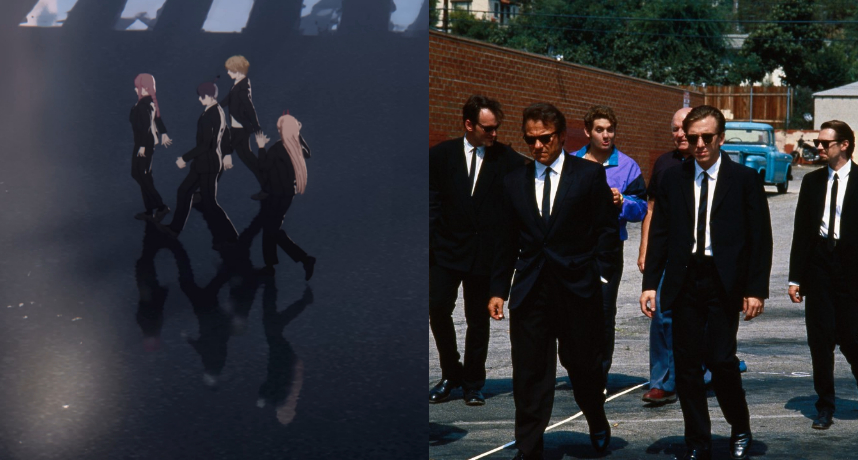 《鏈鋸人》動畫開場以主要角色淀治、真紀真、早川秋、帕瓦等人身穿黑色西裝搭配白襯衫,行走在空無一人的馬路中央為序幕,這個畫面致敬的是1992年的犯罪、劇情電影《霸道橫行》,該電影是昆汀塔倫提諾的處女作及成名作,電影中演員身穿的西裝造型啟發來自於周潤發的電影《英雄本色II》。