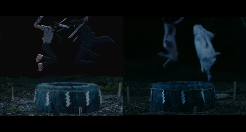 2016年的恐怖電影《貞子vs伽椰子》將傳說恐怖故事「七夜怪談」的貞子和「咒怨」的伽椰子齊聚一堂,原以為是兩大怨靈交錯下的驚悚故事,不過電影中貞子、伽椰子在水井上「對決」的畫面看起來恐怖之餘相當搞笑,成為不少觀眾心中的共同記憶,這個橋段成為動畫《鏈鋸人》片頭的致敬元素之一,成為鏈鋸人的淀治與敵人一決死戰的模樣和電影《貞子vs伽椰子》非常相似。