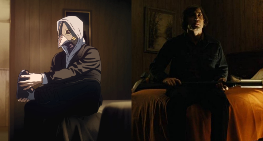 在《鏈鋸人》片頭中頭戴鳥形面罩的人獨自坐在旅店房間低頭穿鞋的畫面,實際上是考究於2007年的知名電影《險路勿近》,該電影是為柯安兄弟執導的美國新西部犯罪驚悚電影,電影中的反社會殺手「安東奇哥」為知名演員哈維爾巴登所飾演,他近似瘋魔的形象和扭曲的笑容深入人心。