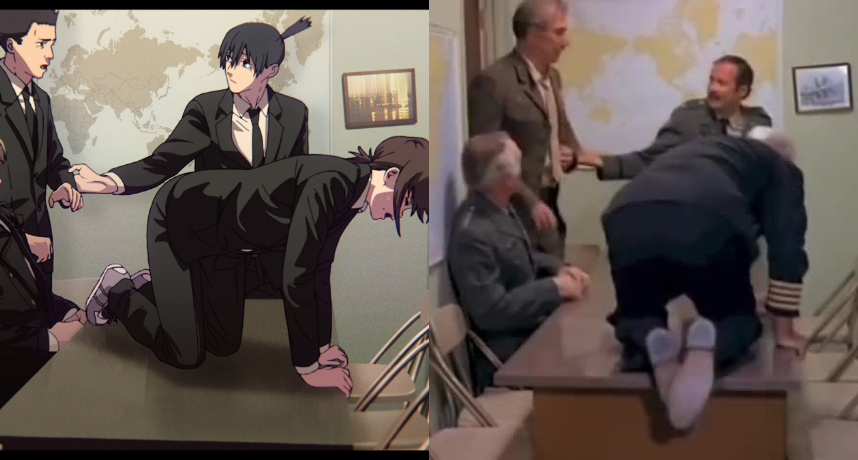 由約翰德貝洛執導的搞怪電影《殺手番茄的襲擊》是講述變異的番茄成為殺手意圖統治世界,一群科學家決定聯合起來抵抗惡勢力的故事,《鏈鋸人》角色跪在桌子上的搞怪場面、人物的動作都和電影名場景一致。