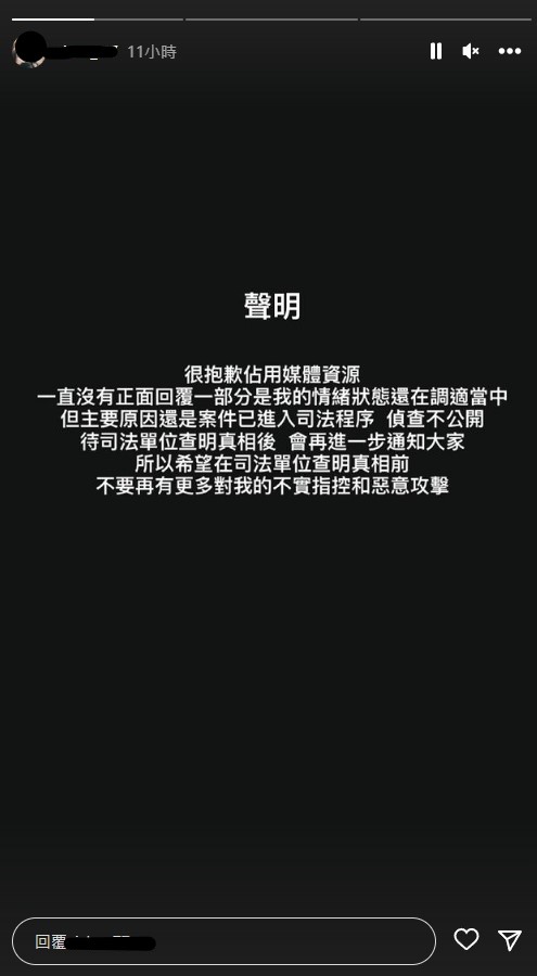 爆料網美昨(15日)在IG的限時動態中PO出一則全黑底圖的聲明文,內容表示:「很抱歉占用媒體資源,一直沒有正面回覆一部分是我的情緒狀態還在調適當中」,同時表明一直未出面回覆的主要原因是因為案件已進入司法程序,偵查不公開,待司法單位查明真相後,會再進一步通知大家,希望外界在司法單位查明真相前,不要再有更多對她的不實指控和惡意攻擊。