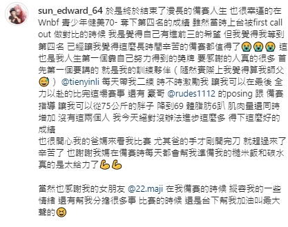 孫安佐除了熱衷於軍事相關的議題外,私底下也十分喜愛運動,他最近還參加了WNBF國際自然健美邀請公開賽,一舉奪得青少年健美70-組第4名,他在賽後罕見發長文感謝身邊所有幫助過他的人,其中包含女友「麻姬兔」,女方的真實身分因此曝光!