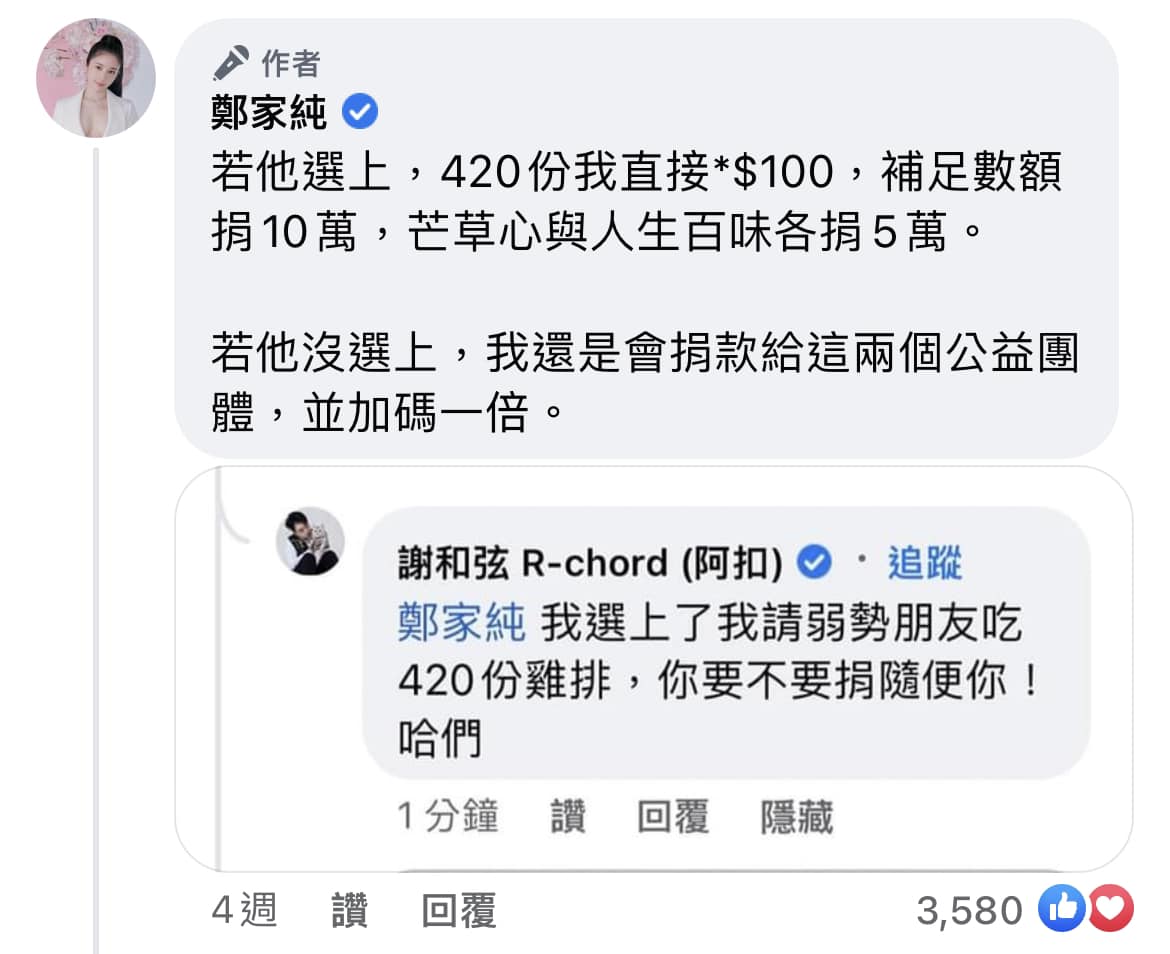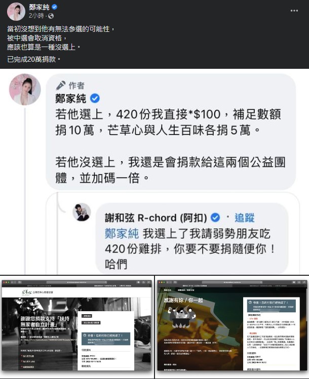 事實上,當謝和弦因違反選罷法而不得登記為候選人的消息曝光後,鄭家純在第一時間就在臉書表示:「當初沒想到他有無法參選的可能性,被中選會取消資格應該也算是一種沒選上。已完成20萬捐款。」並附上捐款及匯款證明,還直言:「做公益比賭雞排好多了」,再度引起關注。