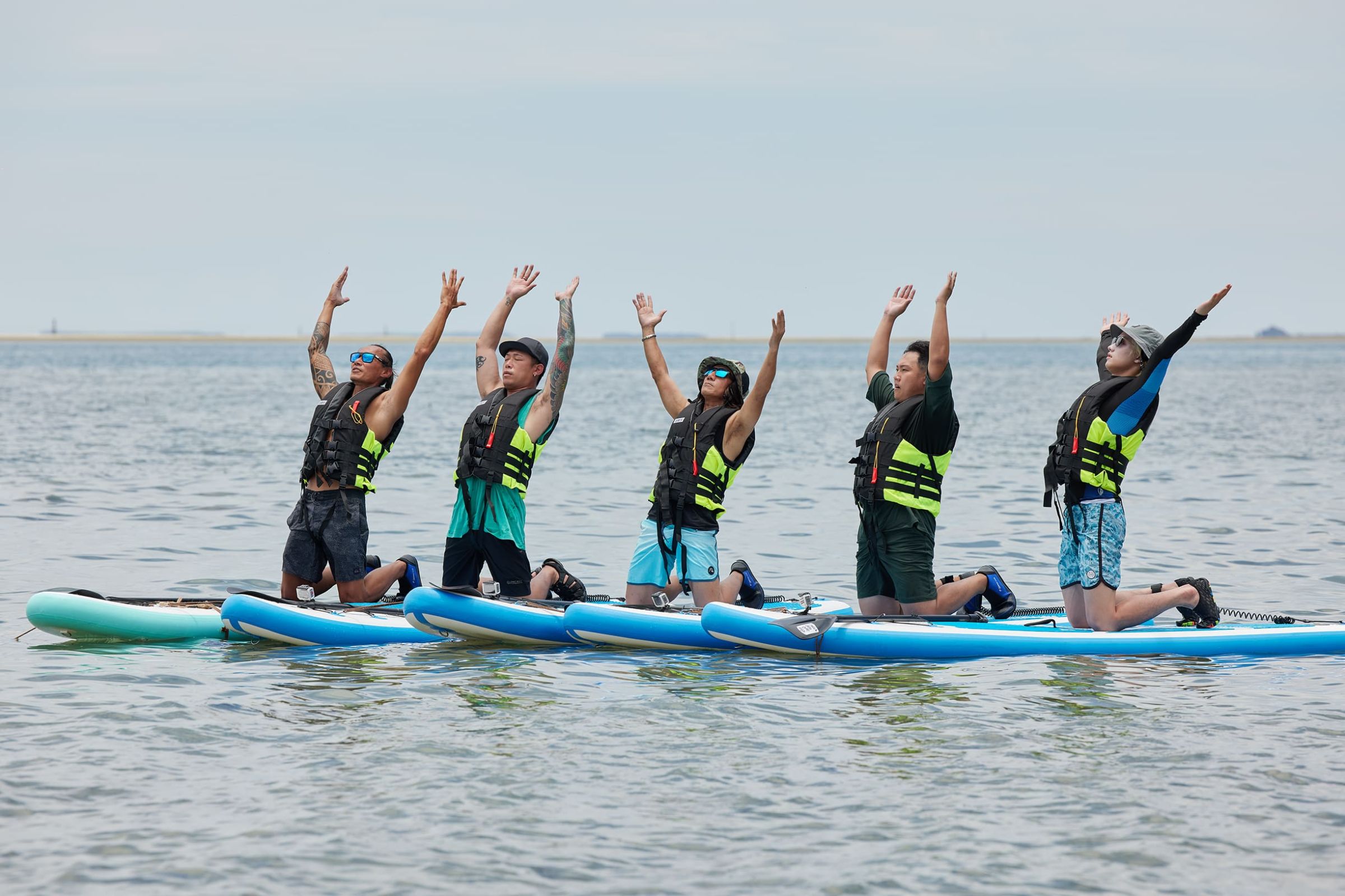 險成日曬人肉乾!大夥一早起床就被大頭家健志吆喝集合,可怕的是在睡眼惺忪的狀況下,一人乖乖抱著一條瑜伽墊走向營地廣場,由於當時拍攝時間是6月底,正值澎湖最炙熱的氣候,7人在逼近40度高溫下做起陸地瑜伽,春風先是拒絕反抗,對著老師說:「我有做瑜伽心臟就會不好的病」想逃避,做到一半更是忍不住爆出粗口,還搞笑問「有聞到塑膠的味道嗎?是不是瑜伽墊燒起來了」,而面對老師高難度的動作指令,林美秀則一直自嘲「做不了、筋骨太硬」!整整高溫曝曬超過一小時才結束課程,讓他們不僅大爆汗還瀕臨中暑邊緣。