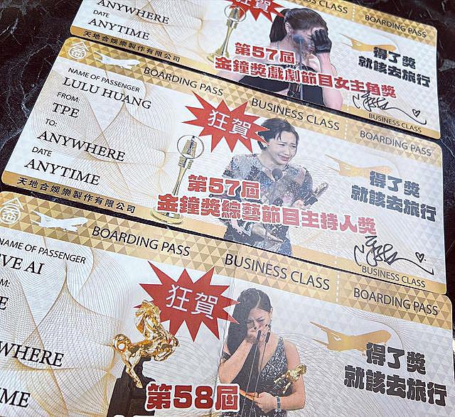原本以為只是單純的吃飯慶祝,沒想到陳鎮川卻突然給了Lulu一張「不限地點、不限時間的機票」,就連同公司的艾怡良、謝盈萱都有,只見機票上還精心印有三人得獎瞬間的模樣,一旁還寫上「得了獎,就該去旅行」,陳鎮川在最後簽名畫押,相當用心!