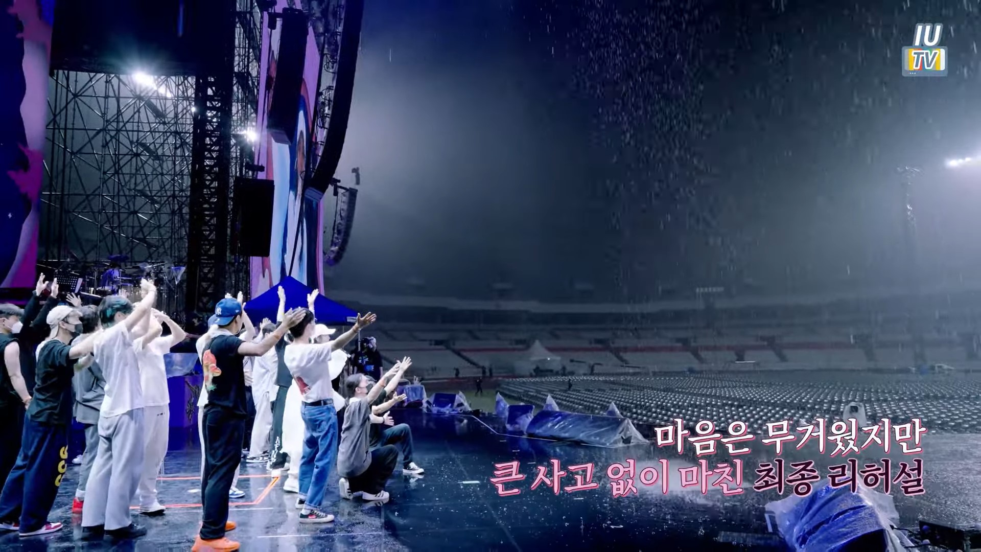 儘管內心沉重,並且還是生涯第一次碰到如此大的暴雨,但IU仍是冷靜且正面積極,不僅樂觀表示可以結合水演出、找能夠讓心情開心的話題,並且還不斷向團隊打氣喊話,「大家不要崩潰!一切會好的!」另外她也只要求舞者「對位置」就好,而最終彩排也在沒有發生任何意外中結束!