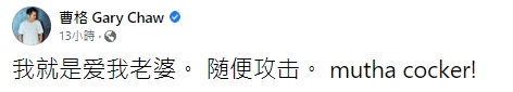 曹格27日凌晨在臉書先是發文表示:「我老婆愛這個人!夠厲害了吧!」隨後又在留言區寫下:「我變壞了」,過沒多久,他便將該文章刪除了。之後又一連發了多篇文,內容包含「我就是愛我老婆, 隨便攻擊,mutha cocker!」、「我在台北,她呢?」、「哈哈哈哈ok」,還在留言區大爆粗口,狀況讓人十分擔心。