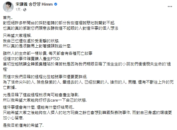 宋讚養在梨泰院事件發生後,第一時間就在臉書更新最新消息,因此獲得了廣大的關注,而他30日在臉書寫下心聲,先是對於拒絕新聞採訪感到抱歉,但希望大家能夠理解,「我自己也還在處於受衝擊的狀態」,所以很難接受採訪,並坦言:「這次的事件確實讓人產生PTSD」。