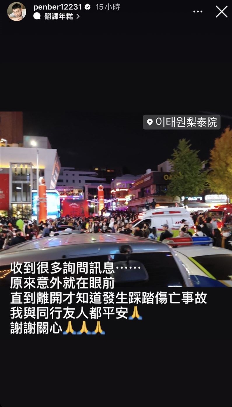 潘柏希在上個月26日飛往韓國旅遊,還時常在社群分享所見所聞,而他日前透露,29日梨泰院踩踏案發生時,人正好在現場,「現在想起來還是餘悸猶存」!他表示當時與朋友正好往事故地點前進,「只剩幾公尺的距離,聽到很多哭聲、慘叫聲」,還看到了很多警消人員及裝扮的人,由於他聽不懂韓文,所以一直以為是萬聖節的表演節目。