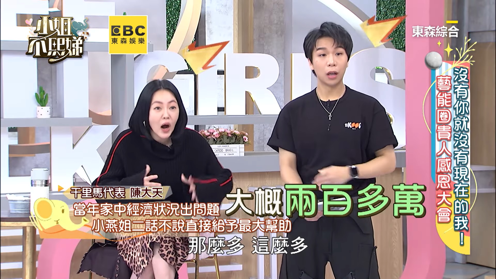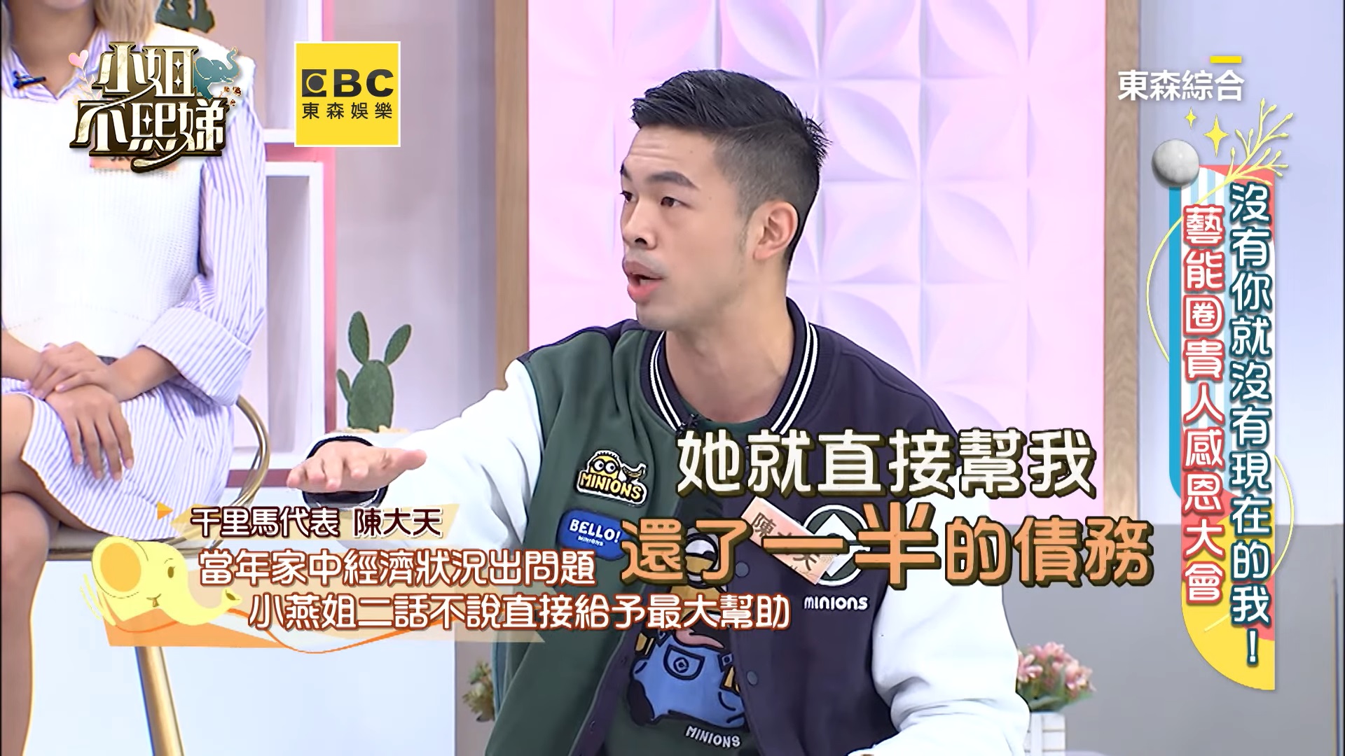 藝人陳大天日前在節目《小姐不熙娣》談到「演藝圈的貴人」,他透露老闆張小燕不僅是伯樂,就連私底下都十分關心藝人的狀況,像是他過去因家中負債而感到壓力很大,張小燕得知後,一口氣幫忙「還了200多萬」,讓他深受感動,就連現場來賓聽了都感到超級驚訝!