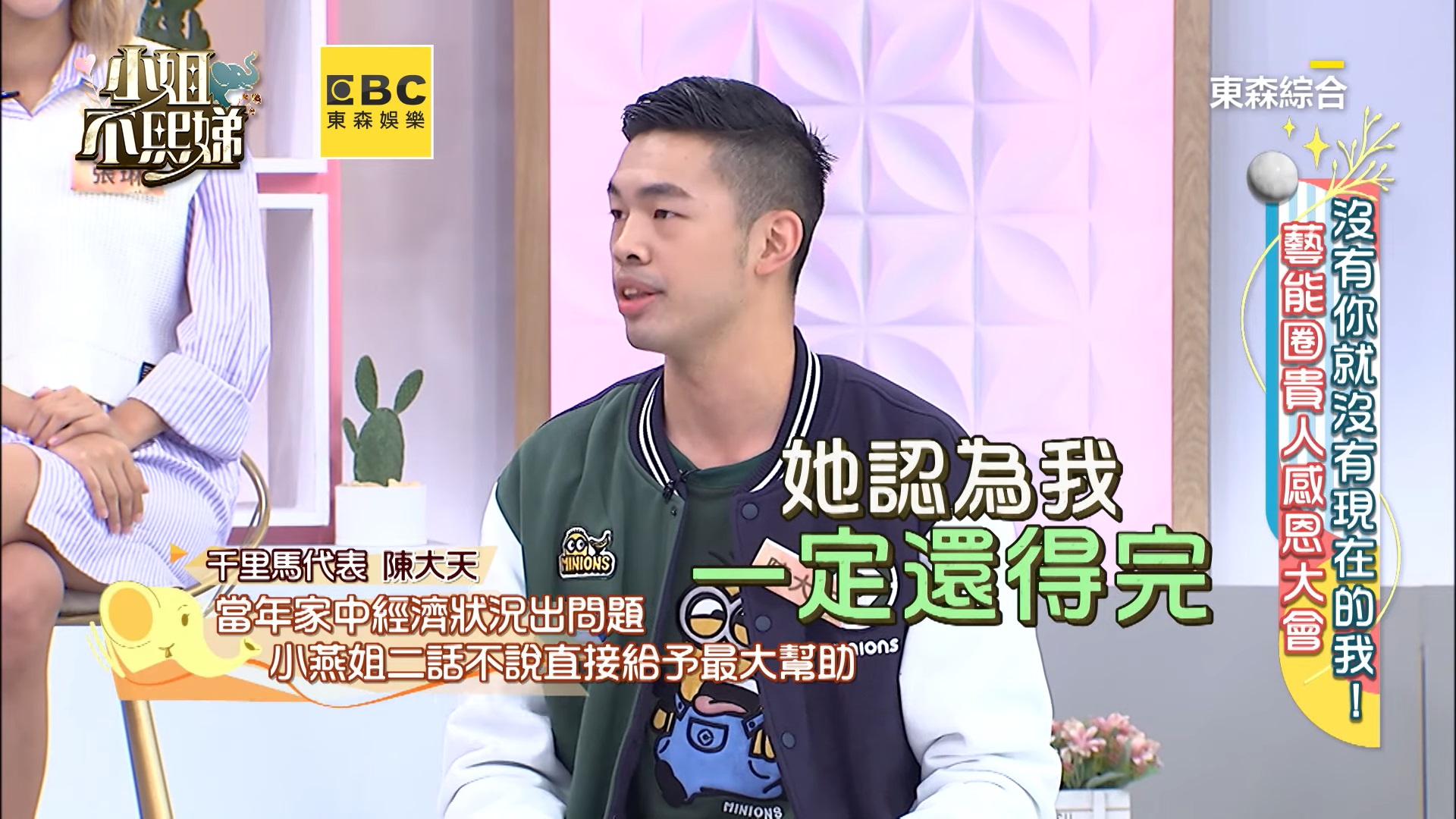 而張小燕會選擇出手幫忙,是因為認為陳大天「一定還得完」,而他之後大概花了5、6年的時間,便將債主及小燕姐的部分全都還清,現在甚至已經存得到錢,還可以買房子,一旁的馬力歐聽了都直呼:「你真的是遇到大貴人」!對此,陳婉若認為每個經紀公司的屬性不同,覺得陳大天比較像是王偉忠的藝人,因此能夠被小燕姐相中真的非常不容易!