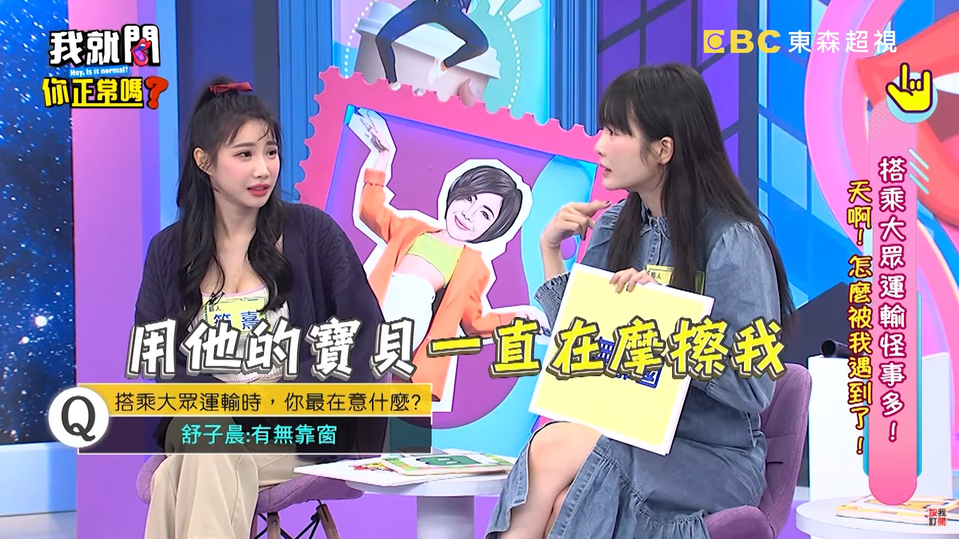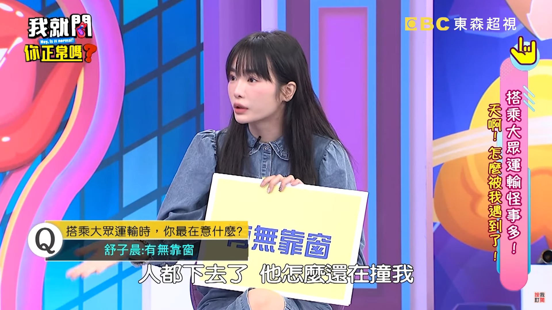 藝人舒子晨活潑的個性、亮麗的外型深受觀眾喜愛,她日前在節目《我就問你正常嗎?》談到搭乘大眾運輸工具發生的怪事,透露曾經遇到變態故意假借公車人潮擁擠之名,實際上卻是用私密部位不斷磨蹭她的肩膀,甚至肩膀上還因此「濕濕的」,超可怕的遭遇讓現場所有人全都嚇壞!