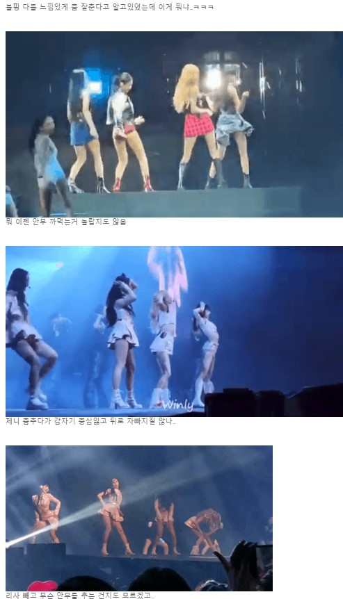 近日有網友在韓國論壇Pann批評BLACKPINK成員巡演狀態糟糕,貼出多張失誤的動圖失望表示,「都說BLACKPINK是舞蹈很棒的團體,但這些是甚麼呀?」他狠酸BLACKPINK似乎已經將忘記編舞視為理所當然,甚至該跳的也不跳,當中唯一就只有Lisa動作確實,「就連接受度高的海外粉絲也感到失望,我不知道這兩年她們到底在幹嘛?」