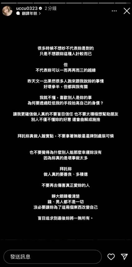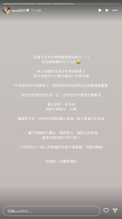 接著,瑀熙7日又發文表示,自己不想吵架,但不代表可以一再越線,「昨天文一出果然很多人跑来跟我說妳的事情,好壞參半,但都與我有關,我就不懂,喜歡別人是妳的事,為何要透過貶低我的手段抬高自己的身價?」透過此事,讓她更加確信不要盲目信任他人,也不要太積極幫助朋友,她更直言:「拜託妳真做人踏實點,不要拿著無敵星星牌到處裝可憐,也不要覺得為什麼別人能那麼幸運,妳沒有,因為妳真的是壞事做太多!」最後,她希望對方不要因為錢跟男人改變自己,盲目追求只會一無所有。