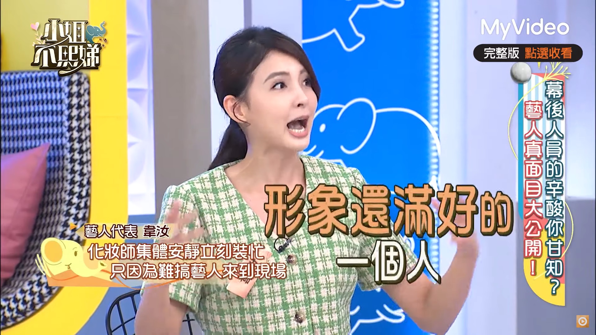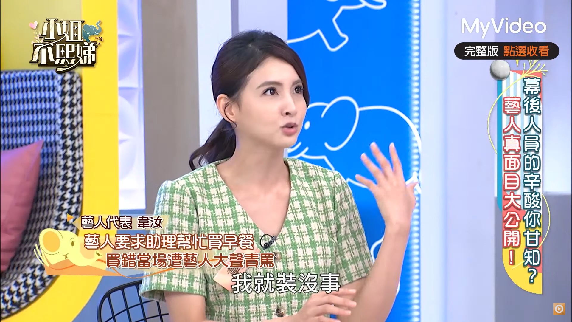 不僅如此,韋汝還有一次目睹助理幫忙買早餐給該位女藝人,由於她不吃小黃瓜,但助理卻沒有注意到此事,於是她當場在化妝間破口大罵,讓韋汝嚇得一身冷汗,小S 聽了都直呼:「她很做自己耶!」更誇張的是,助理表示會把小黃瓜挑掉再給她吃,但該女星沒有因此氣消,反而繼續開罵,「挑掉有什麼用?還不是有那個味道!這樣我怎麼吃啊?」讓韋汝最感到神奇的是,對方只要一進棚開始錄影,就像是換了一個人,對藝人的態度都很好,只有對工作人員會惡言相向。