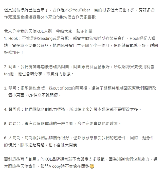 不僅如此,還有在行銷業界任職的網友,在Dcard列出了6位「天使KOL」,其中包含HOOK、阿圓、蔡哥、蔡阿嘎、哈哈台及大蛇丸,其中就點出HOOK的團隊會主動告知近期有競業合作、貼文用心、富含個人特色;阿圓是與粉絲關係很好,帶貨能力很強。該網友還指出只要「KOL夠有創意」,品牌方都常不會有太多規定,「偏偏願意用心看合作需求的不多,卻很多反過來要求代理商配合一堆」,隨便交差了事的人更是不勝枚舉,引起不少業界人士的共鳴。