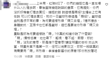 不僅如此,有人表示無論是領隊錢薇娟還是轉播員,都有提到「可以打進去買犯」,是藍隊沒有把握機會,事到如今卻說是「賤招」,但這個招式其實是籃球賽場經常使用的戰術,讓網友更憤憤不平的是,「為何要這樣說『賤』?」指出這個詞只有負面的意思,應該要修正形容的方式,不要讓粉絲失望。