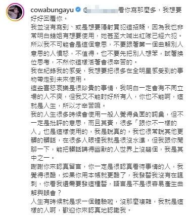 對此,陳妤親上火線回覆該網友的質疑,「我並沒有寫到、或是想要隱射買犯這招賤」,也理解錢薇娟有想使用買犯戰術,「所以我不可能會是這個意思,不要跟著第一個曲解別人意思的人憤怒,不值得。」她解釋自己只是在記錄感受,但明白立場不同的人一定會不開心,「我的人生很多時候會使用一般人覺得負面的詞彙,但不一定是批評的意思」,還透露私底下還會說更糟糕的話,雖然在很多人眼中是沒水準,但她自信表示:「能把髒話講得幽默的人世界上沒幾個,我是其中之一。」對於網友的留言,她認為是一件很酷的事情,也謝謝對方願意認真留言跟看待這一件事情。