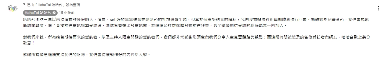 哈哈台自爆出造假爭議後,始終沒有出面解釋,沉默5天後,團隊在10日的新片留言區首度做出回應,「哈哈台街訪三年以來持續有許多假路人、演員、set 好的等等聲音在哈哈台的社群媒體出現,但基於保護受訪者的隱私,我們沒有辦法針對每則臆測進行回覆。」由於訪問的地區遍布全台,所以會依照訪問難度調整,除了現場尋找受訪者外,也會在出發前在社群上預告,或是邀約想要受訪的觀眾加入。