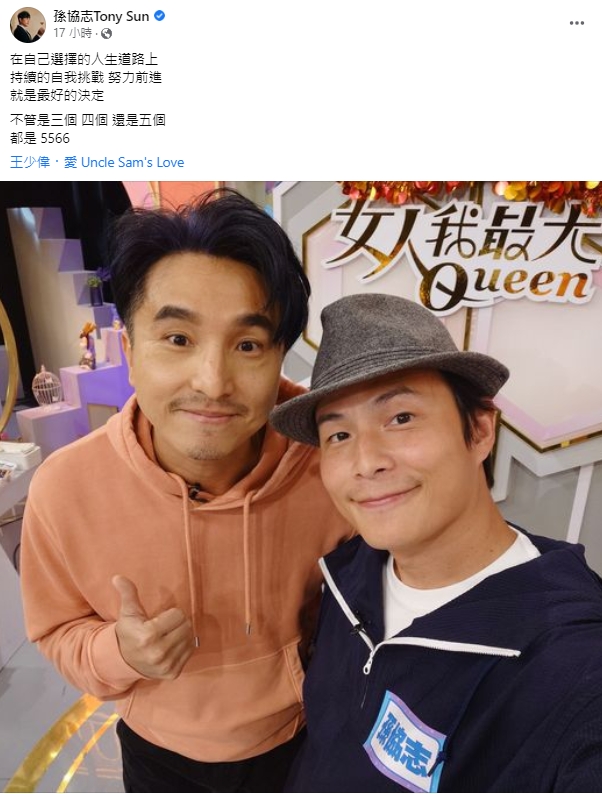 孫協志10日在臉書分享了與王少偉的合照,並開心表示:「在自己選擇的人生道路上,持續的自我挑戰、努力前進,就是最好的決定。不管是三個、四個,還是五個,都是5566」!對此,王少偉除了留言說道:「Always愛你」,隨後也在自己的臉書分享好心情,「還有什麼比今天更開心的」,展現出兩人多年以來的好感情!
