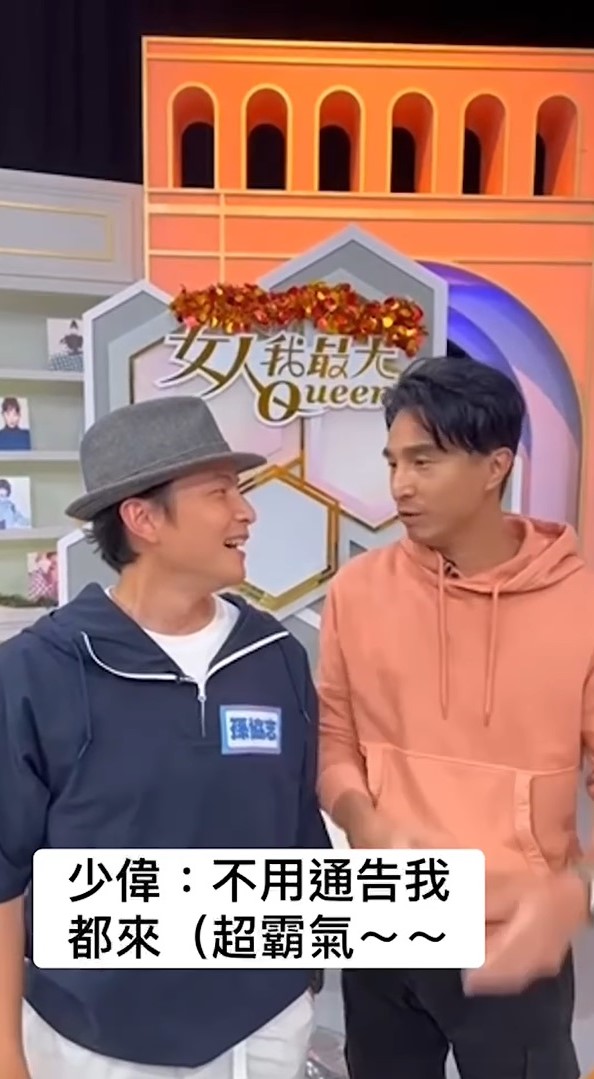 由於孫協志跟王少偉是在節目上相遇,所以《女人我最大》的製作單位還特地錄了一段合體影片,孫協志透露得知來賓有對方時,就立刻答應邀約,王少偉則開玩笑說:「不用通告我都來!」還透露兩人私下約了好幾次,只是前陣子因為疫情的關係,所以一直沒辦法見面,不然早就透過視訊的方式在網路節目合體過了。