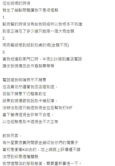 日前有網友在Dcard上爆料,指出11月12日凌晨到野人火鍋用餐,雖然食材的表現非常不錯,但卻在付費的時候發生「店員結錯帳」,由於當時沒有拿到明細,所以不曉得金額有誤,後來在半夜2點21分接到店家的通知,要求回去作廢發票,「電話裡我明確表示不願意,但店員依然纏著我回店裡刷退」,百般不願地回到店裡後,又發生刷卡機故障的問題,所以只能退現金且打九折,讓原PO不滿表示:「為什麼要浪費時間跟金錢收拾你們的爛攤子?當初是衝著KID去的,加上網路上評價還不錯,沒想到卻是這種體驗!」希望店家能夠重新檢視服務態度。