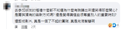 對此,黃豪平現身留言區力挺,「新娘跟凱莉不夠熟,會讓她致詞嗎?如果熟到這種程度,一定也知道凱莉講不出什麼冠冕堂皇的話,大家在生氣什麼?」還有人認為是「超棒的婚禮致詞」,屬於年輕人之間的幽默互動。