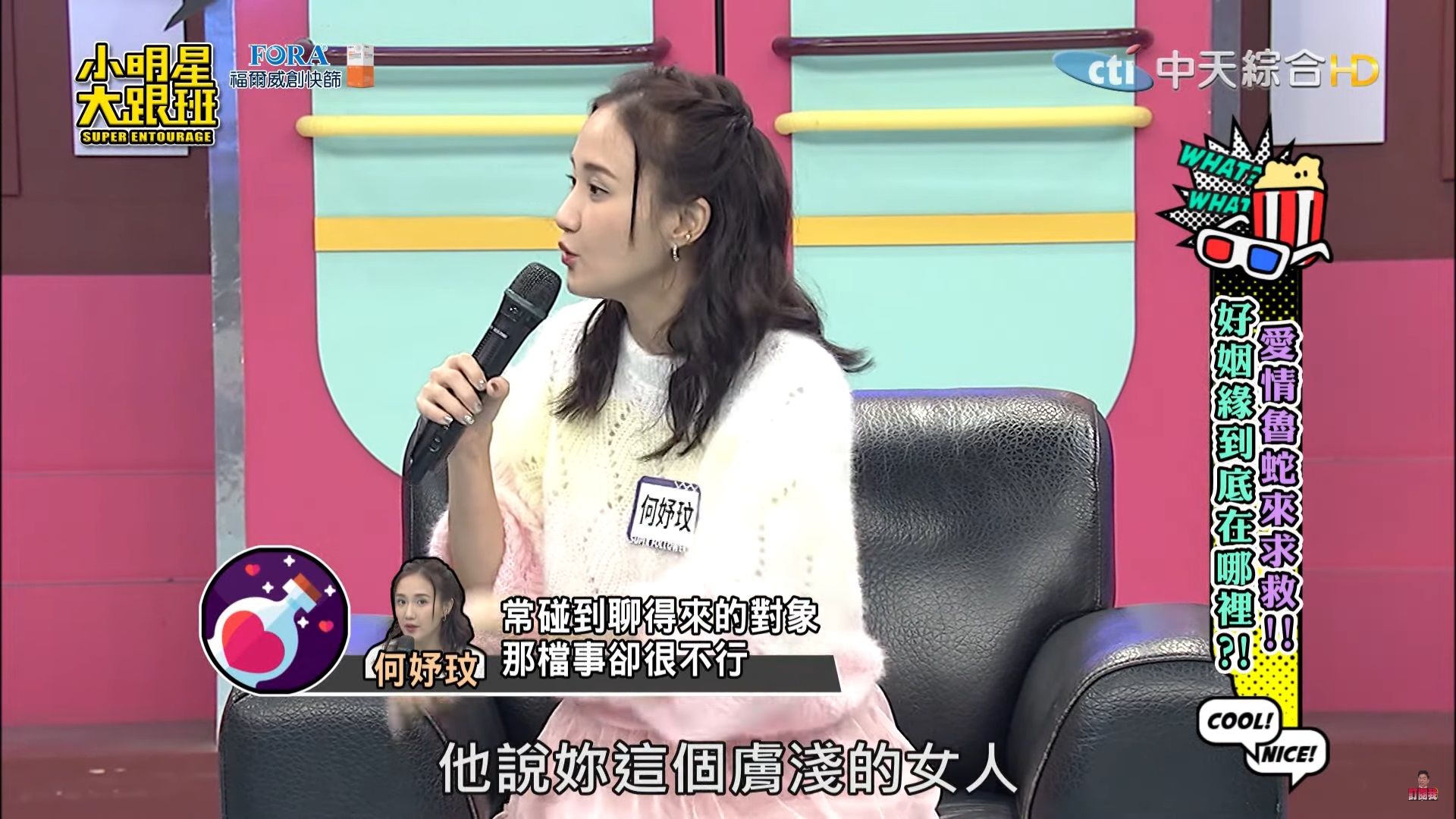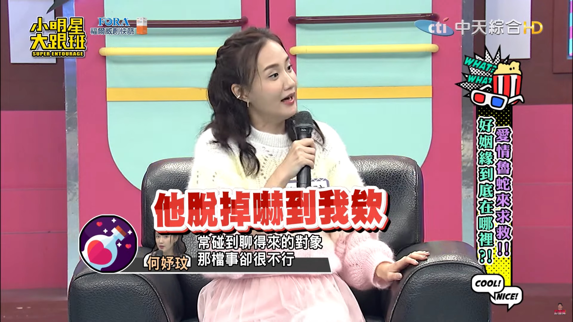 直到某一晚,兩人終於要發生性行為,回想起當時的狀況,何妤玟表示:「他脫掉嚇到我欸!」透露對方下體的尺寸與理想狀況不一樣,「我的態度就慢慢地冷卻」,對方見狀後詢問原因,她竟跟對方說:「我覺得你那邊好像是有一點點……」讓一旁的來賓聽了都直呼:「好傷人!」結果對方一聽瞬間惱羞成怒,並大罵:「妳這個膚淺的女人!妳為什麼只看那方面?」讓她感到相當委屈,認為每個人都有各自的需求,不應該這樣就被責備。