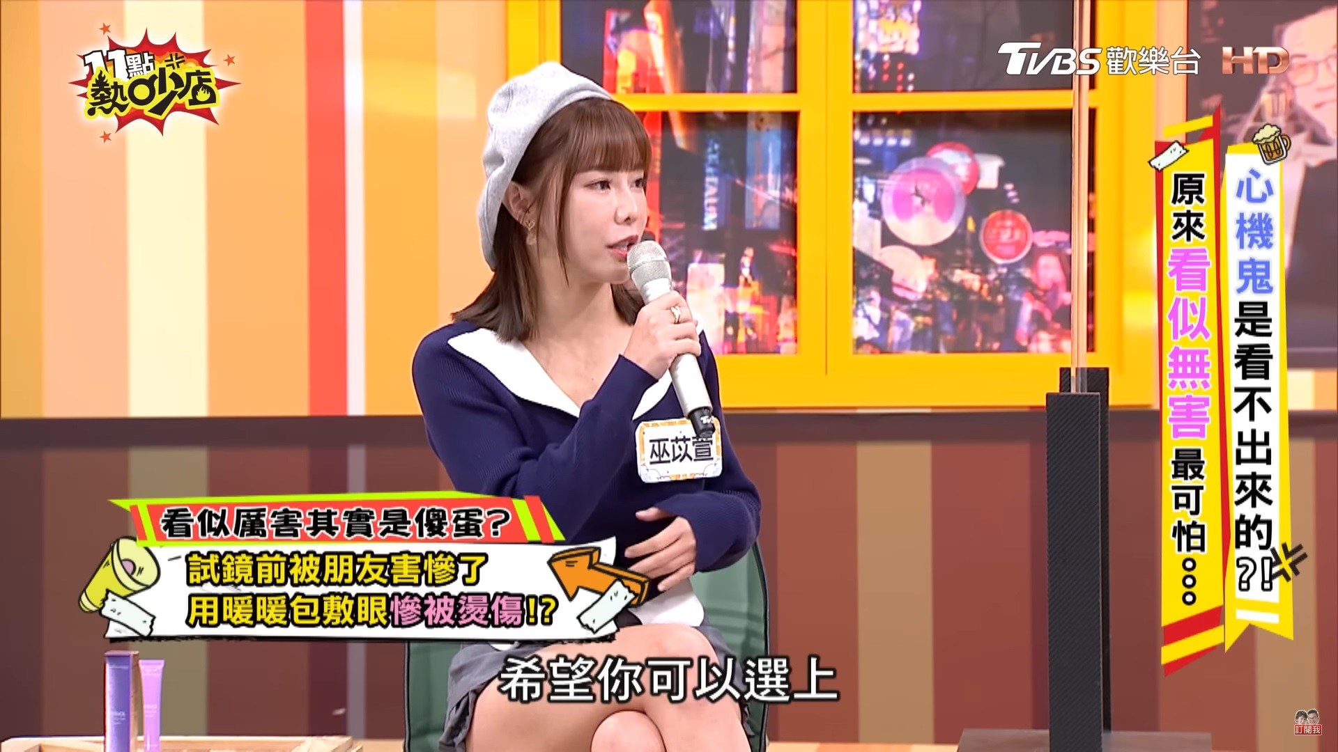 藝人巫苡萱日前在節目《11點熱吵店》分享遇過的「心機鬼」,像是有一次因為要去試鏡,所以向朋友請教讓眼睛消腫的辦法,對方表示:「要用暖暖包敷至少15分鐘」,沒想到卻害她眼皮起水泡,因此錯失機會,後來才得知對方也要去試鏡,所以才搞小動作陷害她。