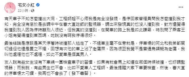 事情發生後,有朋友說:「有些女生沒有下車繞一圈檢查車子的習慣,如果有就會馬上知道在哪個時候被撞,也好調監視器」,但宅女小紅卻吐槽:「有些男生也不會,例如不愛車的工程師。」最後,她提醒大家「下車要檢查」,以免有更大的損失。
